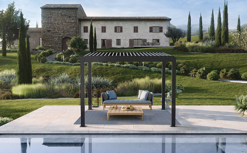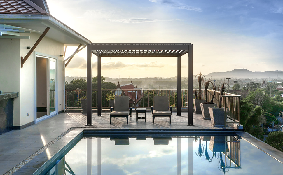 Up to 45mph wind resistance, automatic rain-draining system, ALL-CLIMATE powder coating, prime quality of pergolas&gazebos!