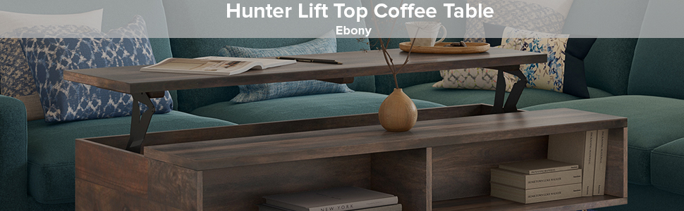 Style and convenience are at work in this uniquely functional Hunter Lift-Top Coffee Table. The top lifts up to reveal hidden storage, pulling toward you for the perfect surface to type on your laptop or eat in front of the television. The table features two open compartments for stacking books or displaying decorative objects. Hairpin legs along with Mango Wood add an industrial component.
