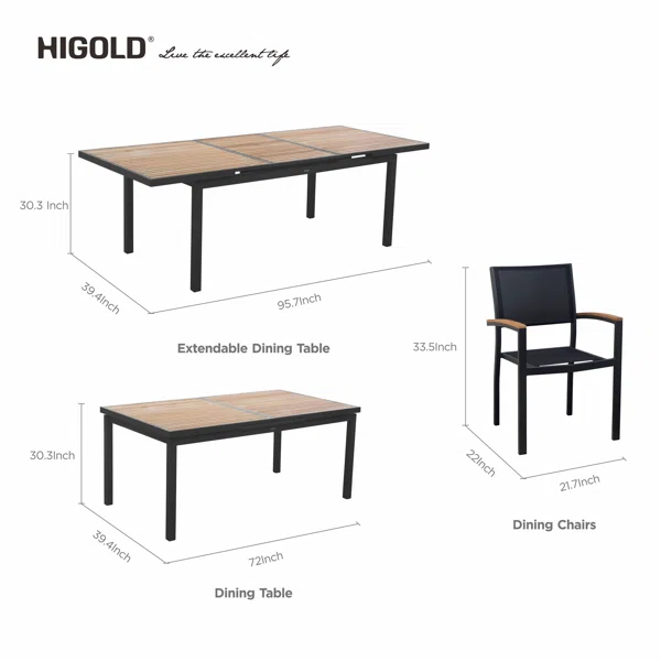 - Durable and strong: Our outdoor furniture is treated with a multi-step finish for ultimate weather protection. Made from an all-aluminum frame, the dining set is very lightweight, easily moves the chair, and never gets rusty. All-weather comfort The dining chairs feature PVC-Coated Polyester sling fabric that conforms to your body shape while providing weather-resistant performance, and will not fade in 5 years. Weather-resistant, UV-resistant, and water-resistant. Teak wood will change from natural brown to elegant gray under the sunshine in 3 months (natural law), brush the teak oil or sealant can make it bright constantly like the yacht teak deck.