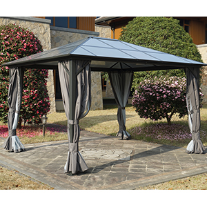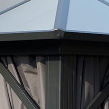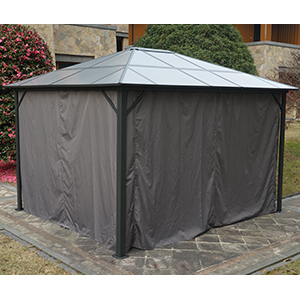 Kozyard 10ftx12ft Polycarbonate Top Aluminum Permanent Gazebo with Layers SidewallsThe Edward Aluminum Gazebo elevates your backyard, or other outdoor space, adding an element of comfort and sophistication that’s certain to impress your guests.The 6mm thick polycarbonate sheet cover provides protection against the sun's harmful UV rays to keep you in a comfortable cool space on hot sunny days.The polycarbonate sheet is charcoal gray color, beautiful and modern color matching with other decorations in your home.Specifications: