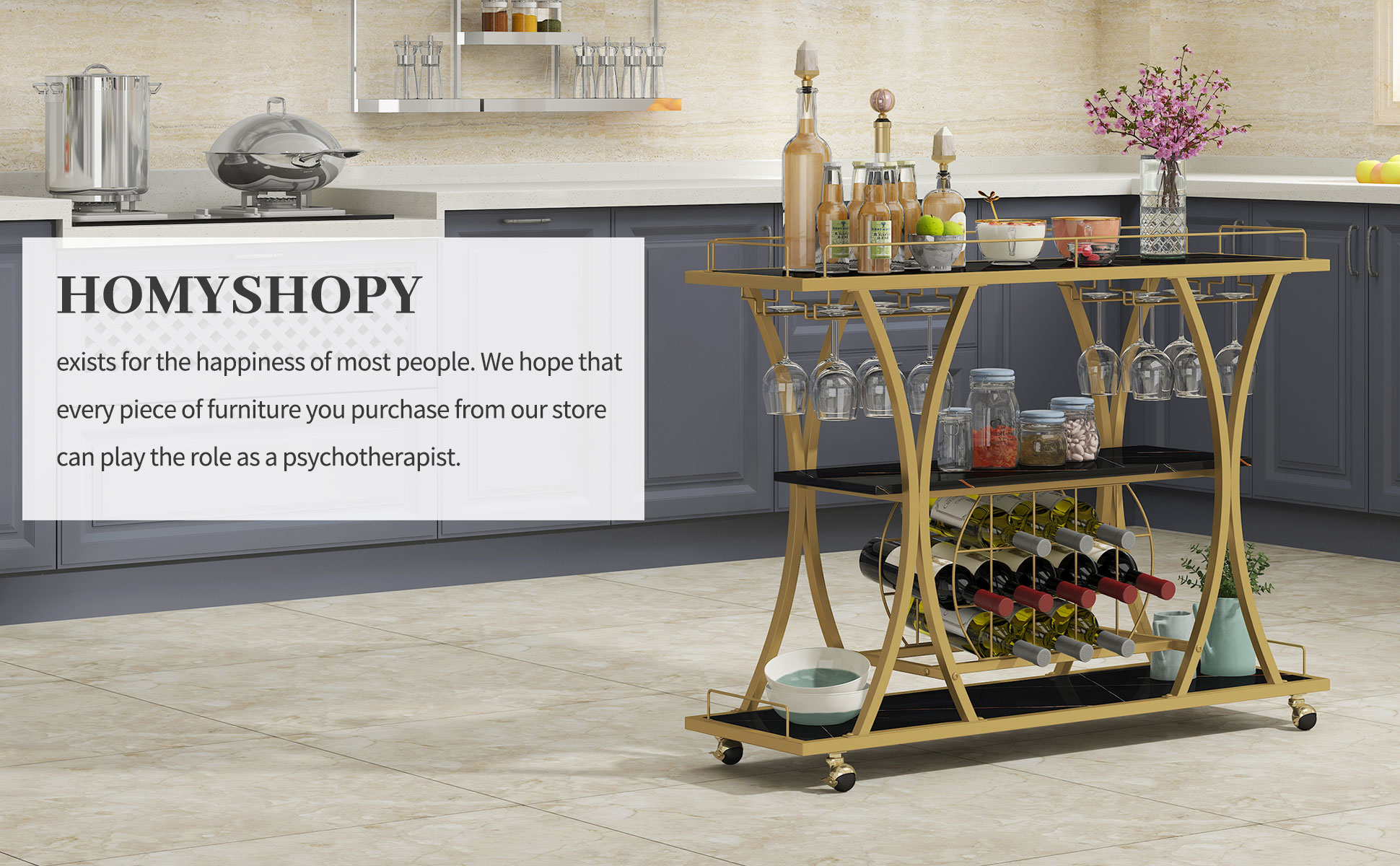 The bar cart features with glass holder and wine rack, hold up to 12 standard size stemware and 9 wine bottles. It is a perfect choice for you to serve guests and friends in party, birthday and wedding.