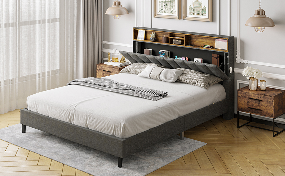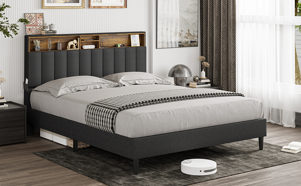 • 【Furniture】Queen Bed Frame with USB Ports and Outlets, Upholstered Platform Bed with Storage Headboard