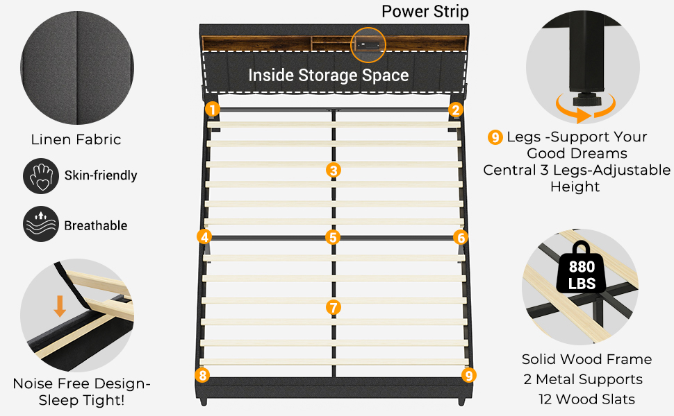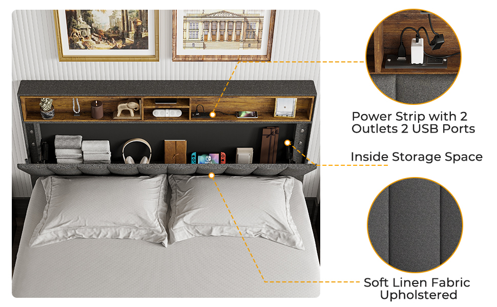 【Adjustable Height Headboard】Adjustable Height: 43.7’’-47.7’’. It can fit queen size mattress in different thickness 10’’--14’’. This modern platform bed frame with power strip and storage headboard upholstered in high-quality linen fabric, soft to the touch, and the storage headboard is expertly constructed with dense foam padding for the night after night of restful sleep.