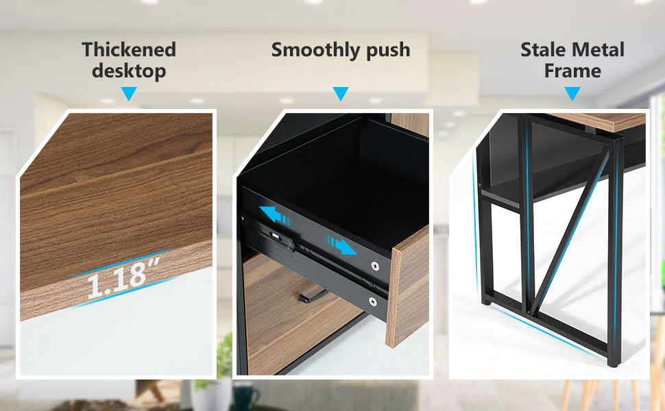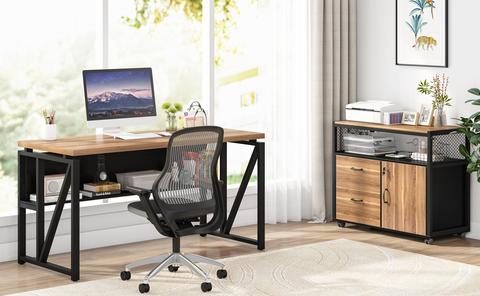 • 【Sturdy & Beautiful finish】:The office desk constructed of heavy-duty metal frame and thickened compressed board (1.2 inch) ensure durability and stability. The furniture set is a combination of vintage colors and black match any decor style.